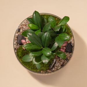 Ficus ginseng, Fittonia, cushion moss, stones and soil